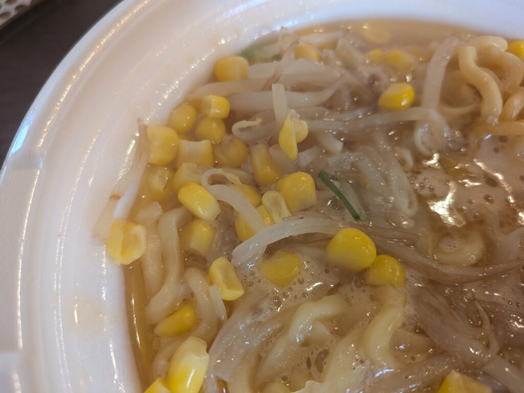 具材の主役は何といってもコーンですが、脇を固めるメンバーも優秀です。もやしのシャキシャキ感や、ひき肉の旨みが、一杯のラーメンとしての完成度を高めています。